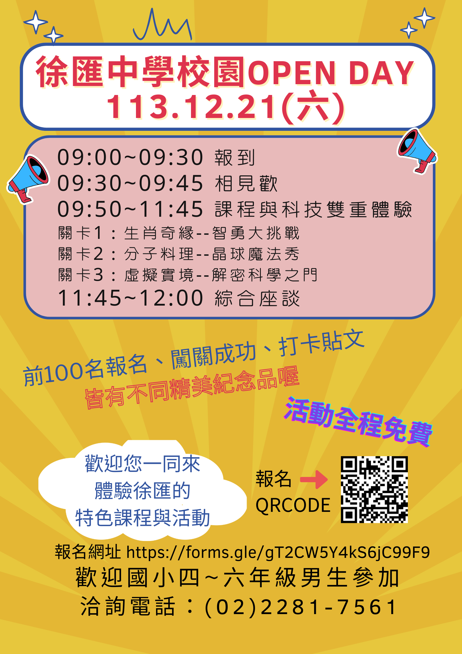 徐匯高級中學著重培育學生具備自覺、才智、愛心、豪氣四大能力,歡迎國小學生參加「徐匯OPEN DAY」,體驗學校特色課程及特色活動。