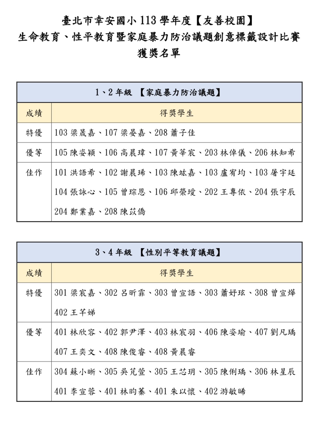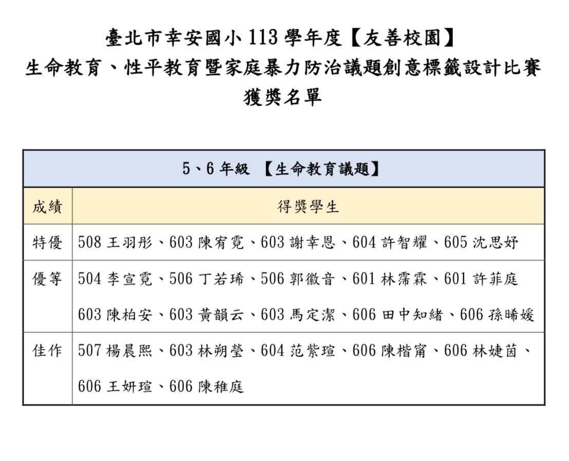 113學年度友善校園創意標籤設計比賽得獎名單~