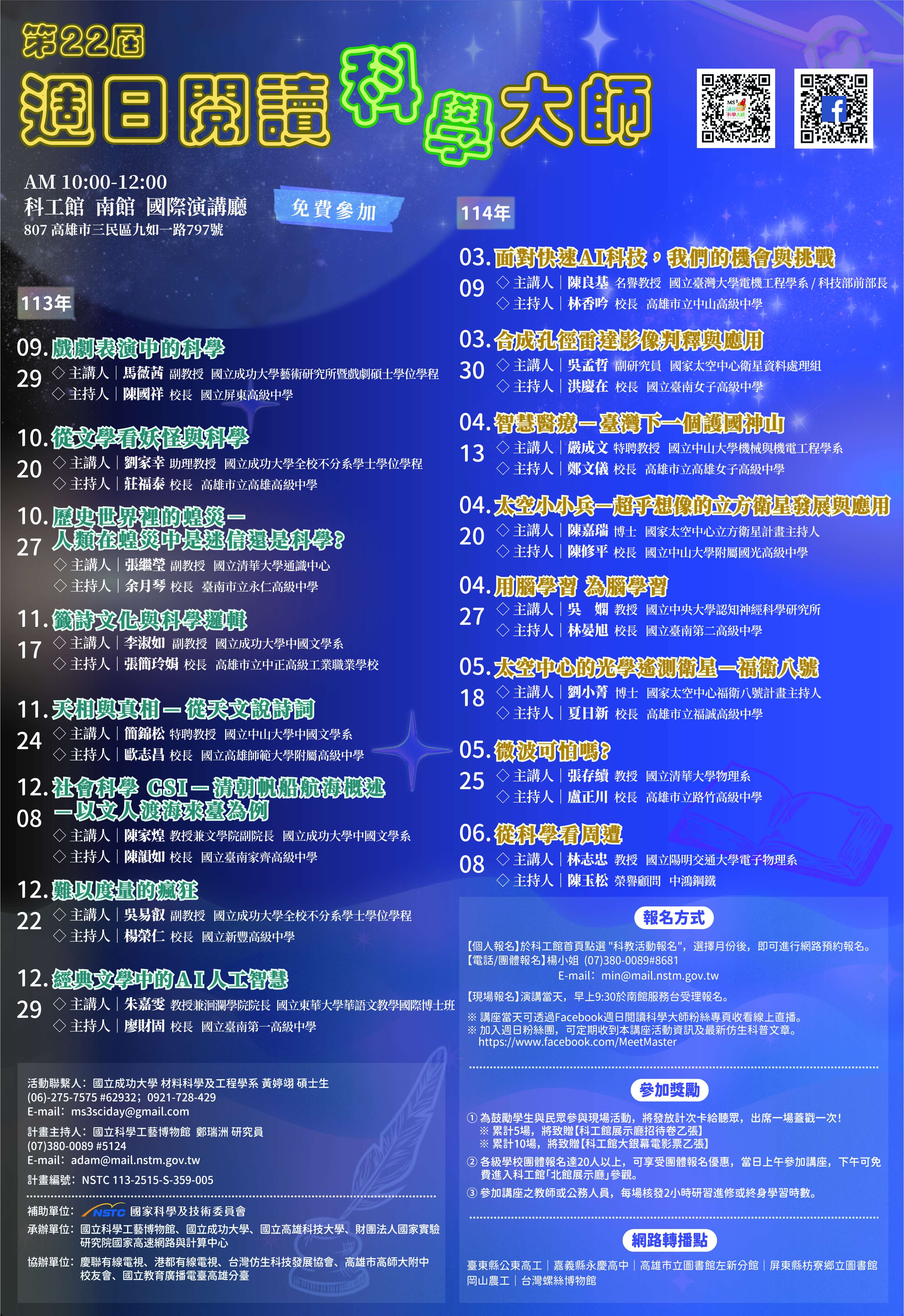 國立科學工藝博物館「第22屆週日閱讀科學大師」系 列科普講座場次表及海報
