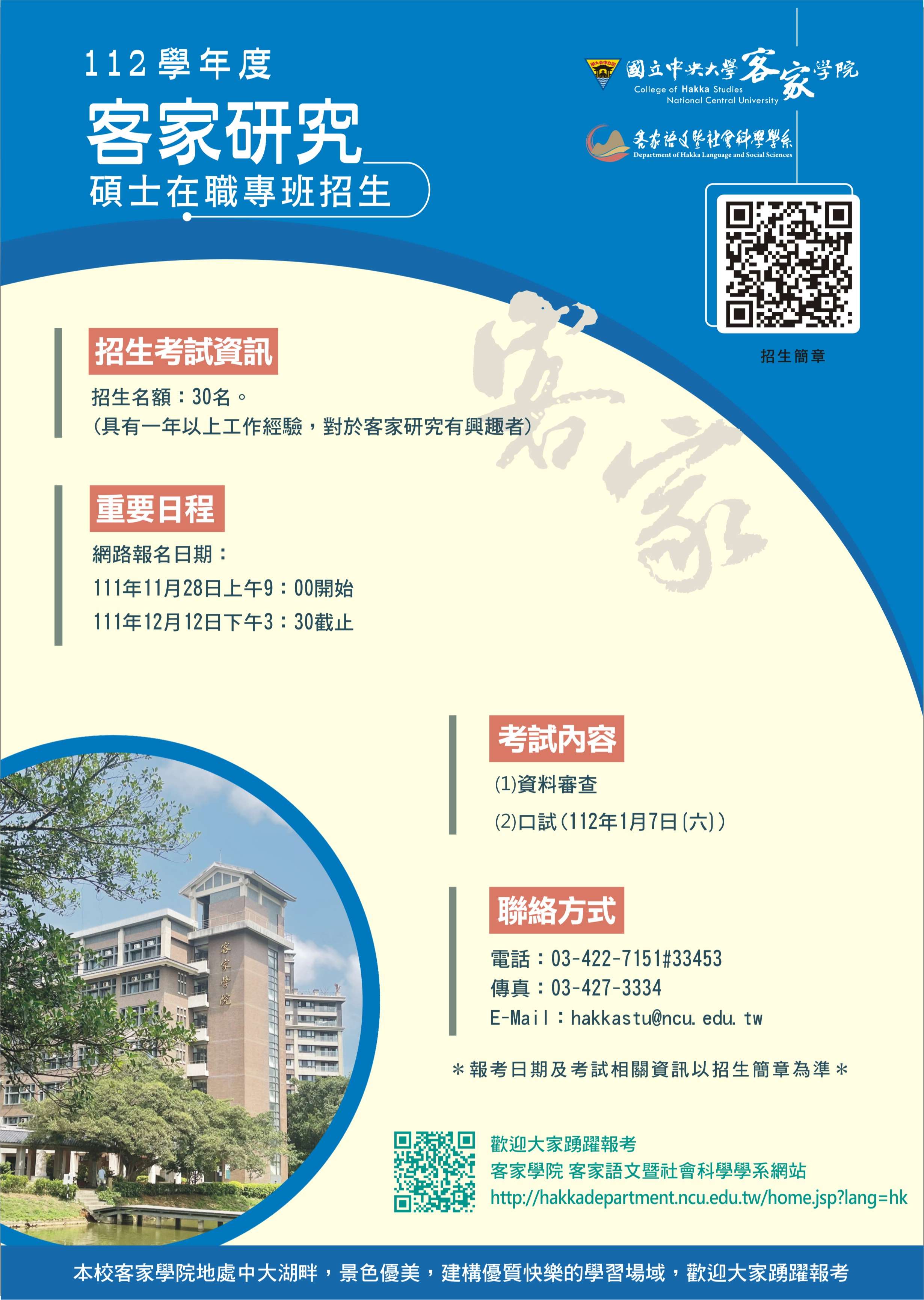 一、本校客家語文暨社會科學學系「客家研究碩士在職專班」112學年度招生,考試內容為:資料審查(免筆試)及口試,招生海報如附件。
