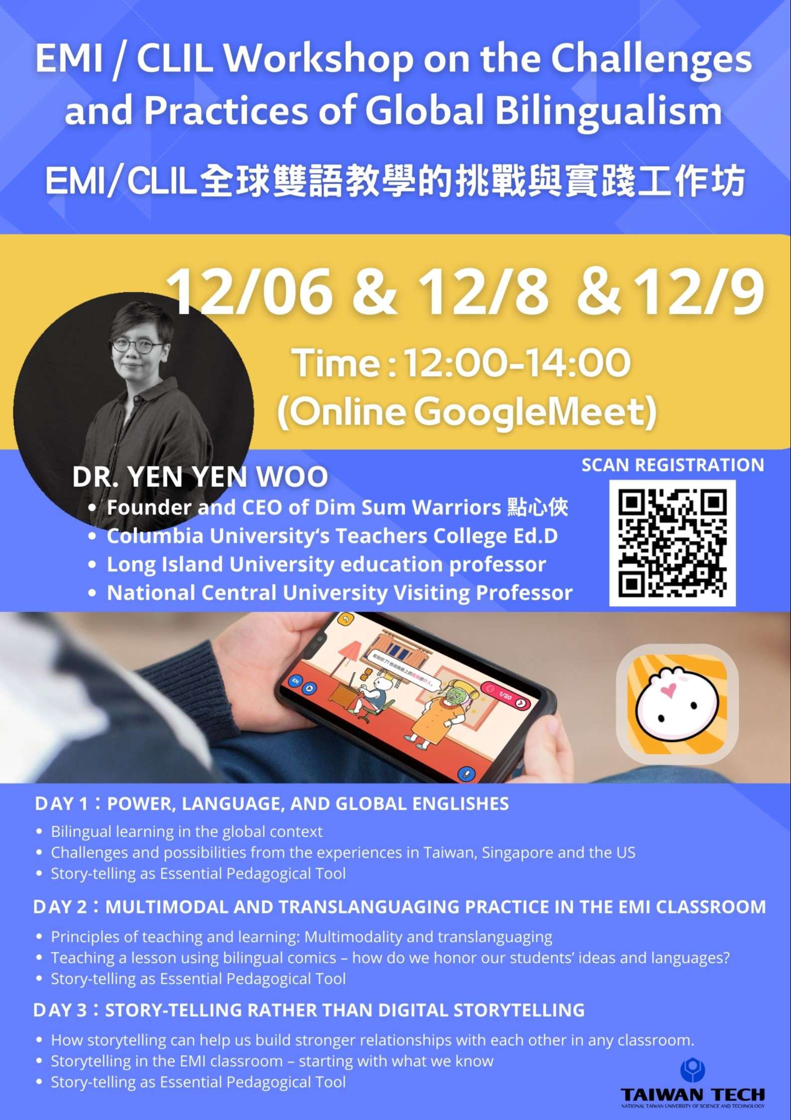 二、旨揭工作坊分別辦理12/6、12/8及12/9場次,可核發全國教師在職進修網研習時數,請先至以下表單進行報名: https://reurl.cc/kqaDM9。