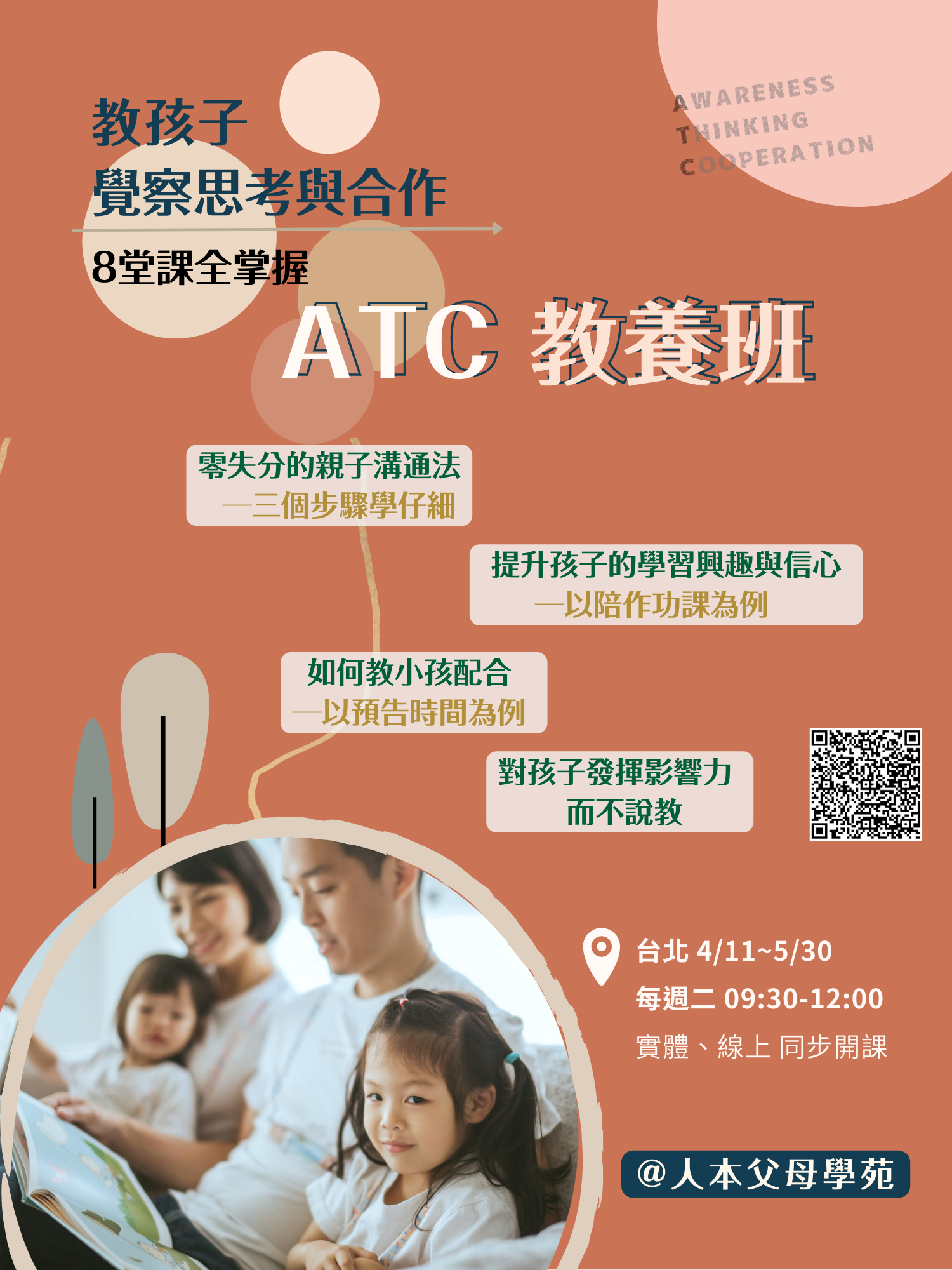 一、本會擬於112年4月11日至5月30日,舉辦「人本父母學 苑-ATC教養班」課程,包含四個講題: 1.零失分的親子溝通法~三個步驟學仔細 2.提升孩子的學習興趣與信心─以陪作功課為例 3.如何教小孩配合─以預告時間為例 4.對孩子發揮影響力而不說教。