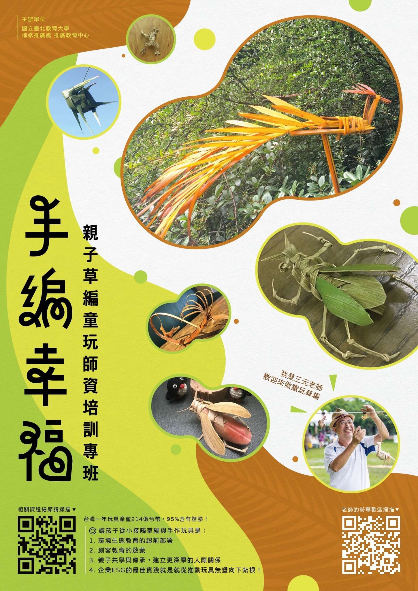 一、草編幸福-童玩技藝師資培訓:112年4月8日週六9:00-16: 00共6小時,全勤並通過評核將核發研習證明書。課程特聘專業草編達人「草編CEO林三元老師」親授,包含戶外採集、戶外與教室型態的教學示範、草編文化歷史理論介紹,豐富多樣的內容不藏私分享,歡迎18歲以上對草編童玩有興趣之教師或一般民眾報名。