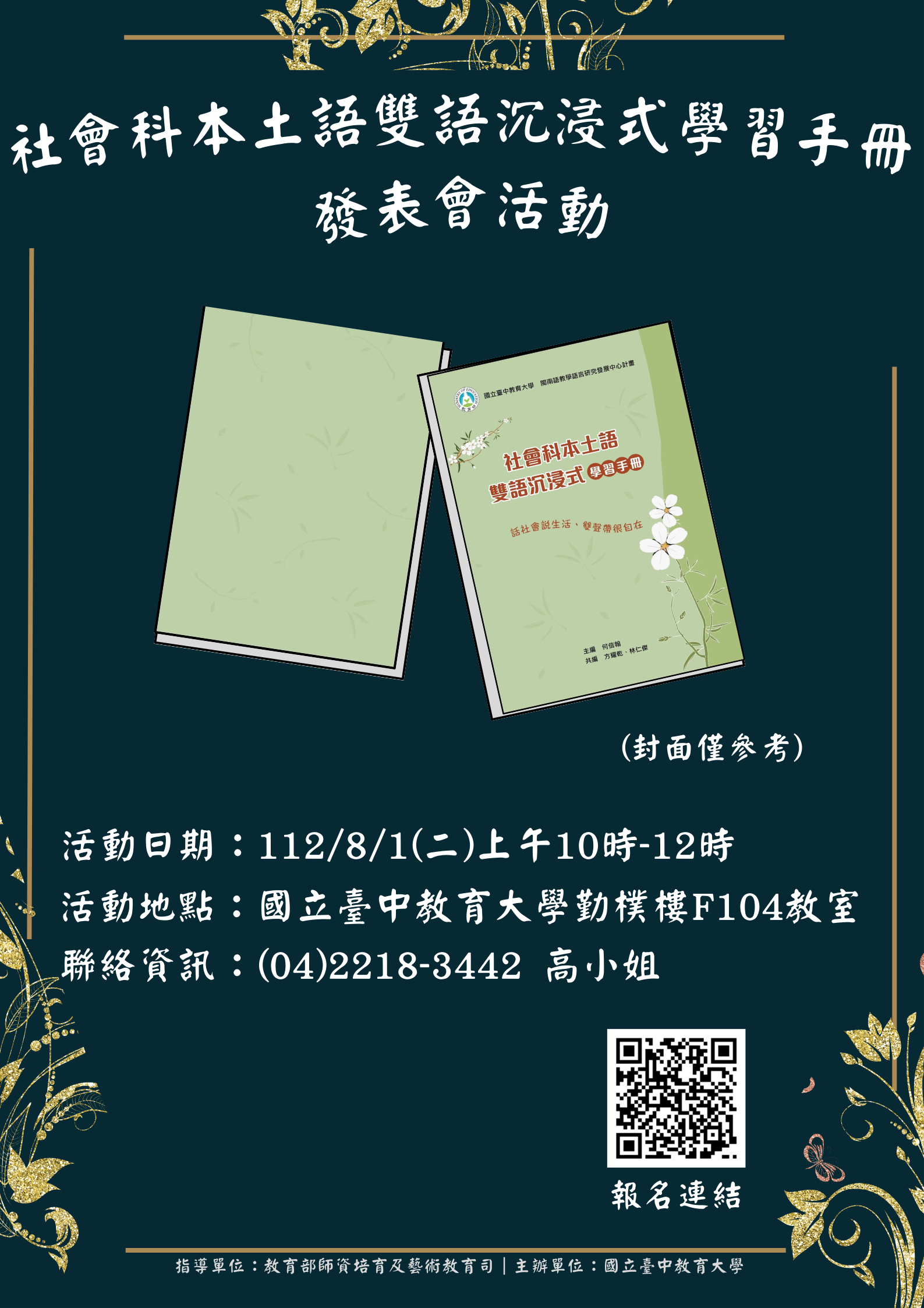 二、活動目標:教育部閩南語教學語言研究發展中心計畫「國小生活、社會領域之沉浸式雙語團隊小組」耗時兩年研發製作,採用配合教育部十二年課綱之國小生活及社會課本,根據當時出版年級,涵蓋生活領域一、二年級、社會領域三年級及四年級上學期,盤點適合現場教學者使用之本土語文沉浸式雙語單元,且搭配閩華雙語詞彙、錄音檔,藉由手冊發表會活動成果,以期作為教師輔助教材可參考之資源。