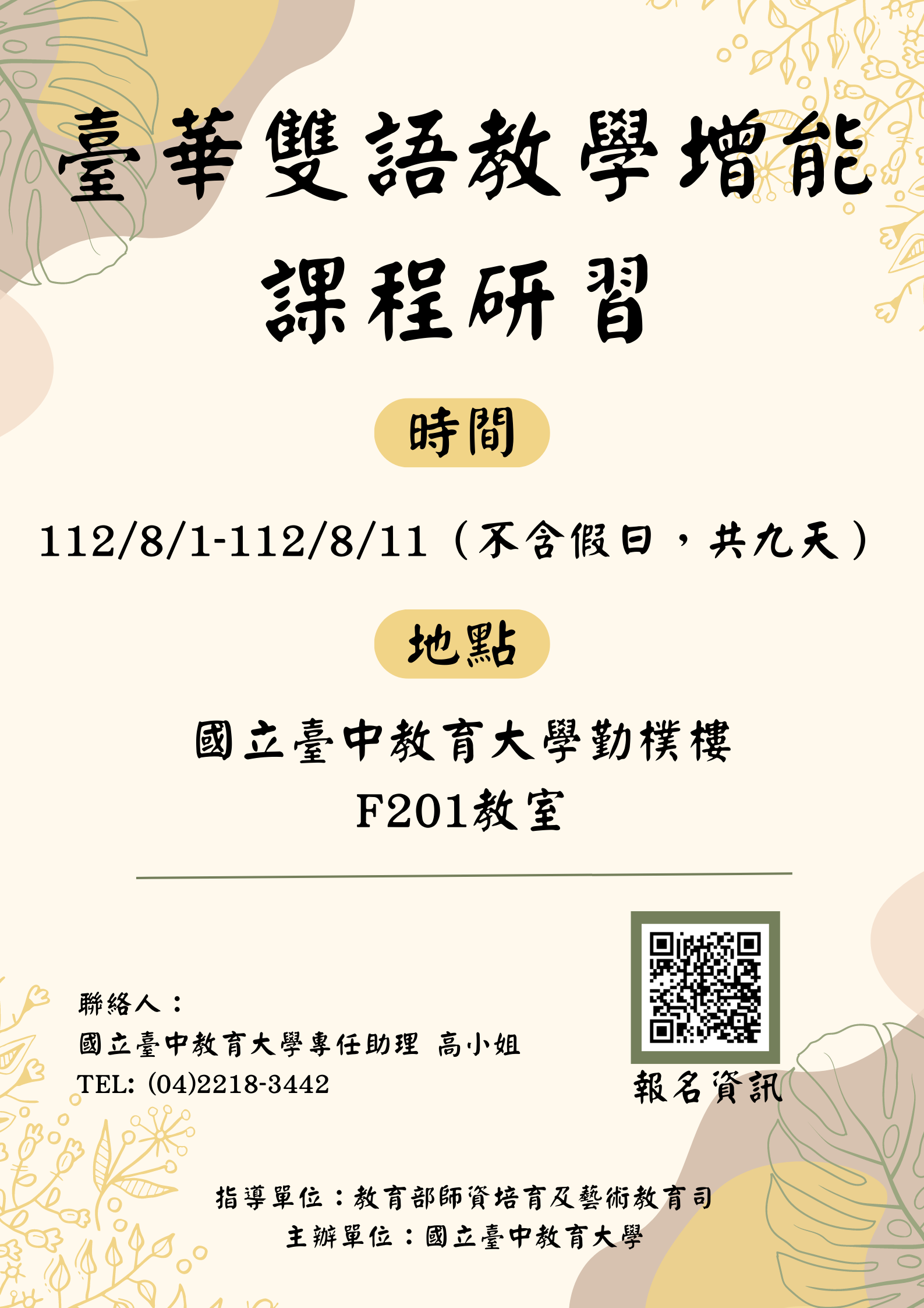 四、研習日期及地點:112年8月1日至112年8月11日(不含假日),國立臺中教育大學勤樸樓F201教室。