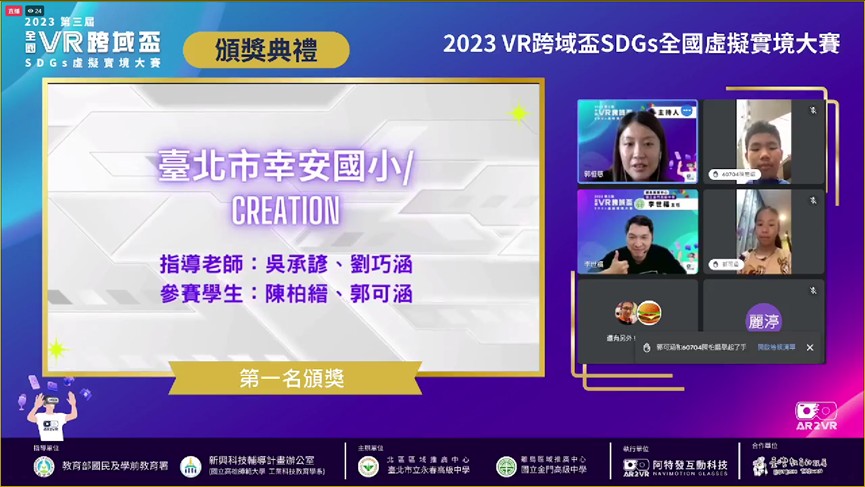 狂賀 本校陳柏縉 郭可涵同學參加2023全國VR跨域盃SDGs虛擬實境大賽榮獲 國小組 第一名 ,這幾個月來兩位選手費盡心思,從組隊、發想、創作、修改,讓作品優化再進步,感謝校內兩位指導老師的協助與家長的用心陪伴,讓我們給選手們掌聲鼓勵。
