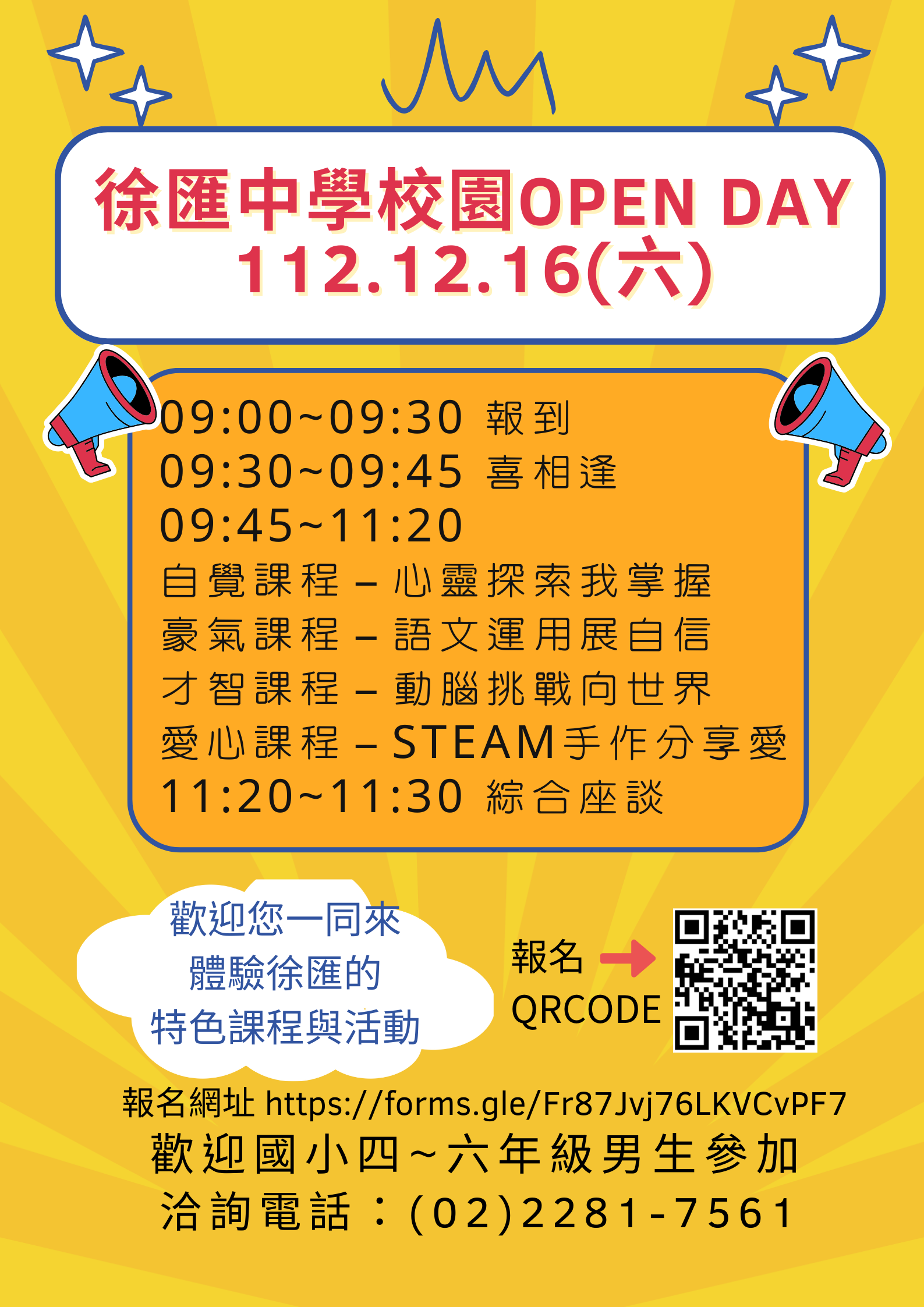 說明: 一、本校著重培育學生具備自覺、才智、愛心、豪氣四大能 力,歡迎國小學生參加本校辦理之「徐匯OPEN DAY」,親 自體驗本校特色課程及特色活動。