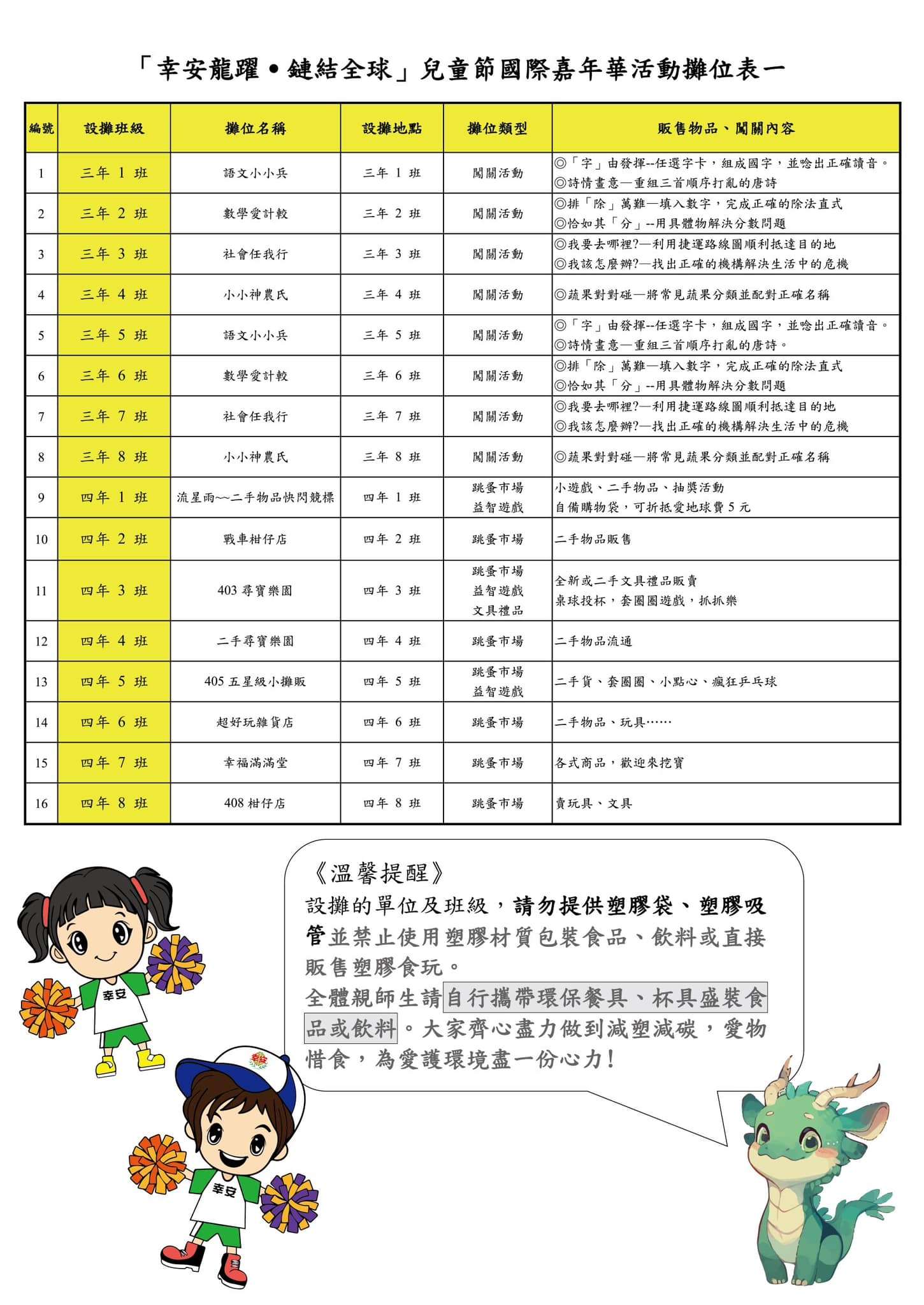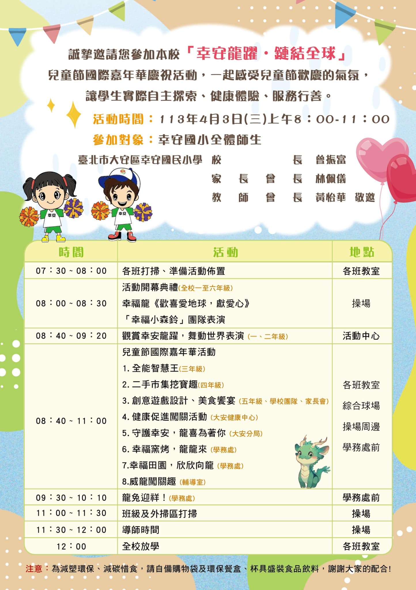 誠摯邀請幸安親師生一起到幸安國小參與113年4月3日(三)上午八點舉行的兒童節國際嘉年華園遊會活動,和孩子們一起感受兒童節歡樂氣氛,跟著孩子們實際體驗、自主探索、服務行善,陪伴就是兒童節最好的禮物