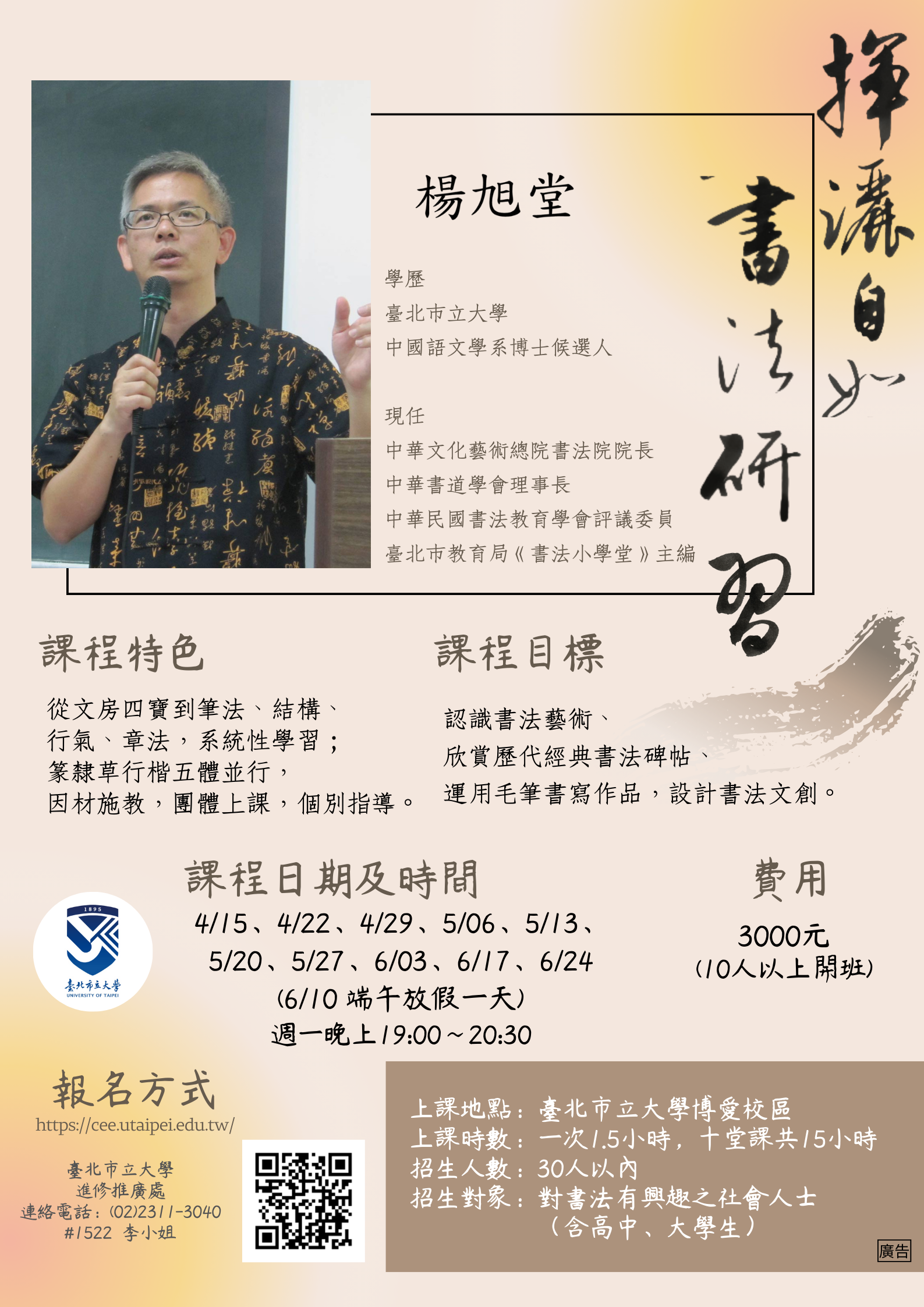 三、師資:楊旭堂老師(中華文化藝術總院書法院院長/中華書道學會理事長/臺北市教育局《書法小學堂》主編)。