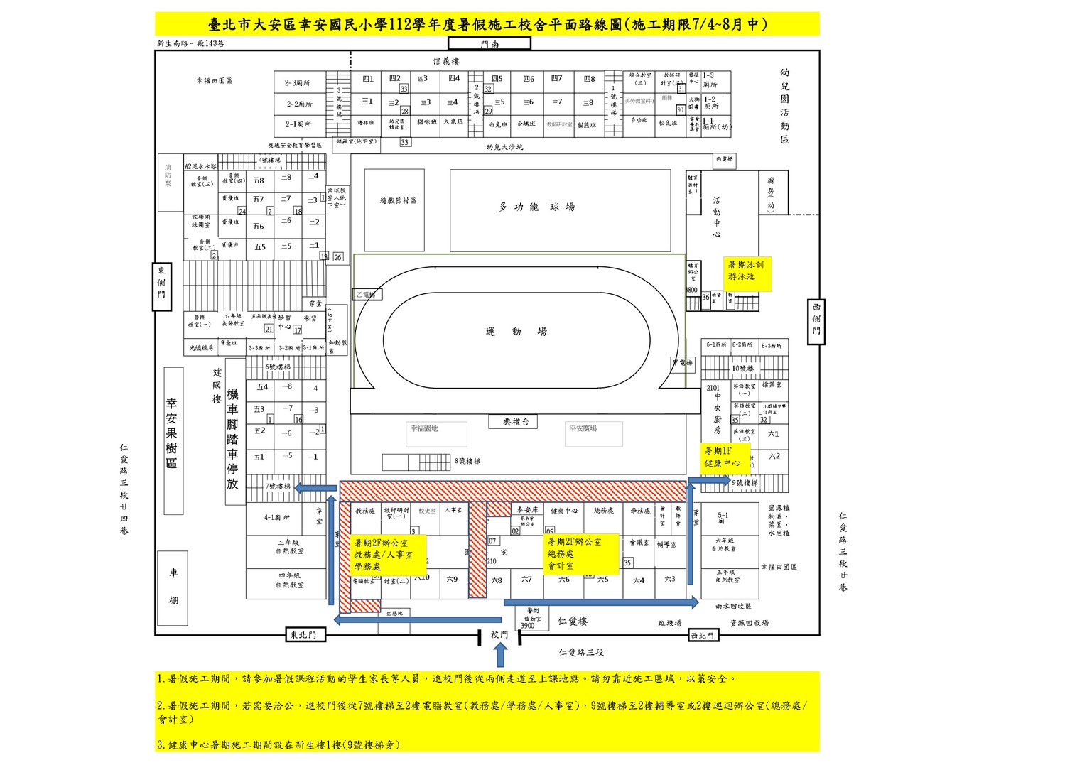 1.暑假施工期間,請參加暑假課程活動的學生及家長等人員,進校門後從兩側走道至上課地點。請勿靠近施工區域,以策安全。(請參考圖片)