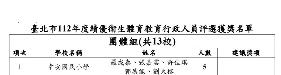 本校榮獲臺北市112學年度百大績優衛生體育教育行政人員評選金質獎