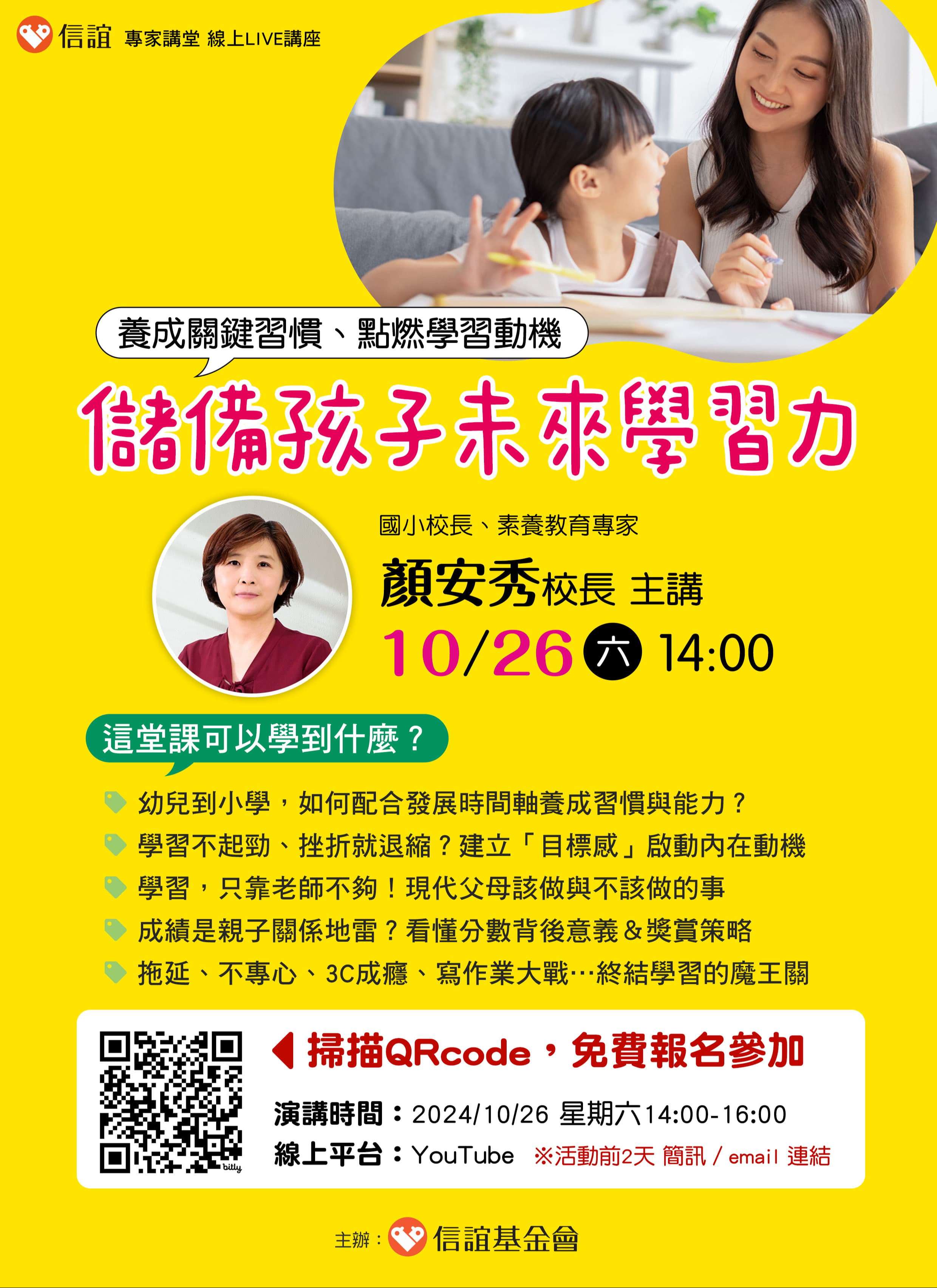 一、信誼將於2024年10月26日(六)下午2:00-4:00舉辦【養成關鍵習慣、點燃學習動機-儲備孩子未來學習力】線上LIVE講座,邀請爸媽免費報名參加。