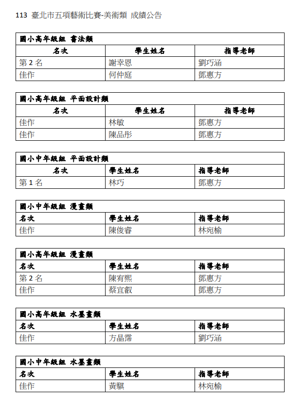 恭喜本校同學參加臺北市113五項藝術比賽—美術比賽榮獲佳績,也感謝林宛榆老師、鄧惠方老師、劉巧涵老師的指導。