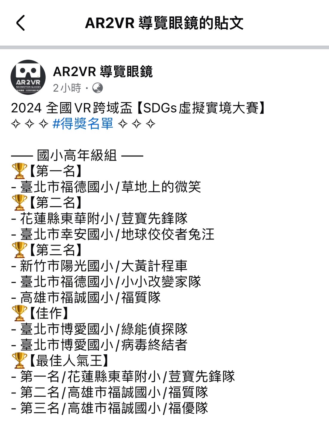 恭喜本校學生參加2024 全國 VR跨域盃 SDGs 虛擬實境大賽,榮獲 #全國第二名,大家請掌聲鼓勵鼓勵。