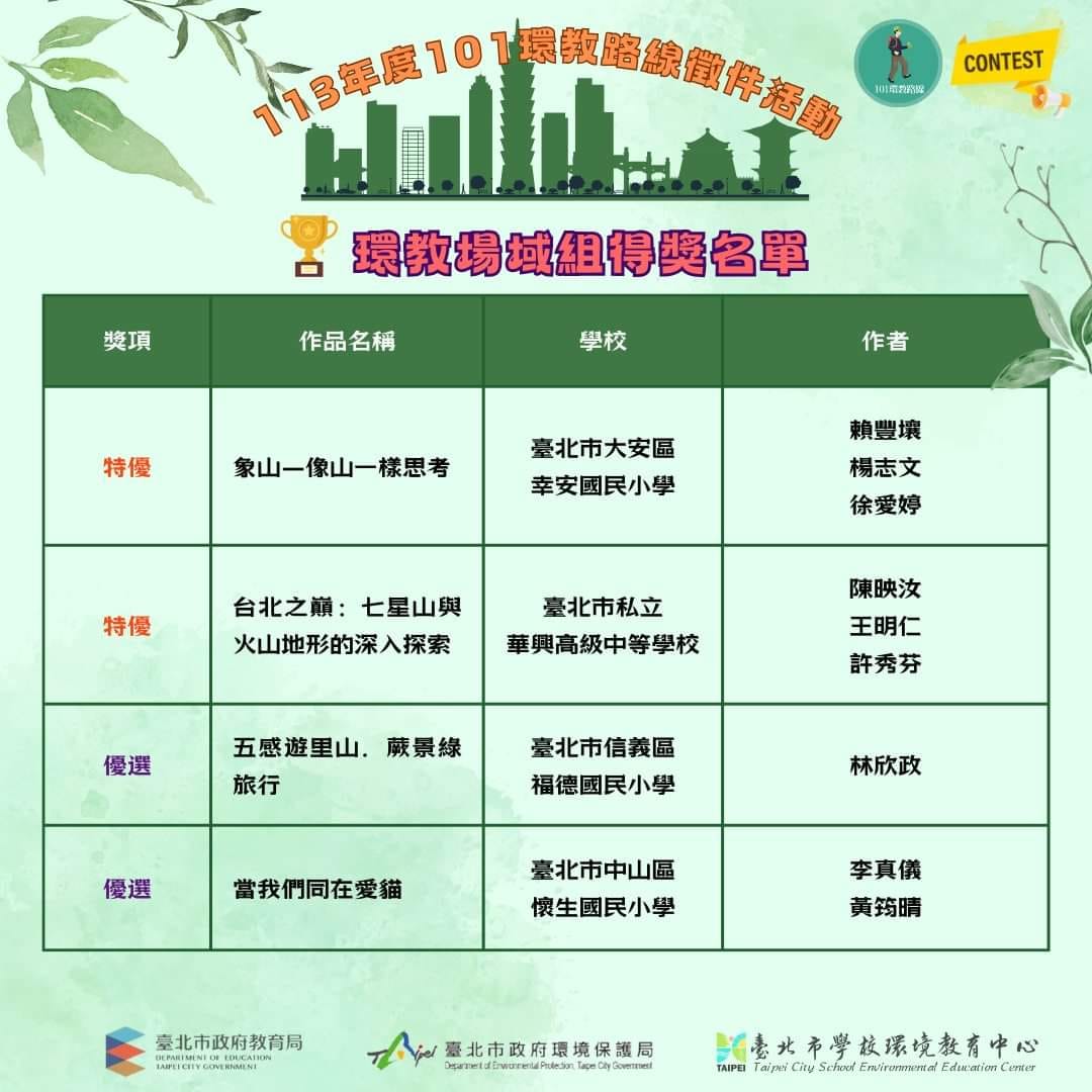 恭喜本校賴豐壤老師與文化國小跨校合作教案比賽,榮獲113年度臺北市101環教路線徵件競賽“環教場域組”#特優,歡迎大朋友小朋友一起利用臺北市環境教育中心推動的101環教路線,讓北市戶外教學活動更加多元與完善。