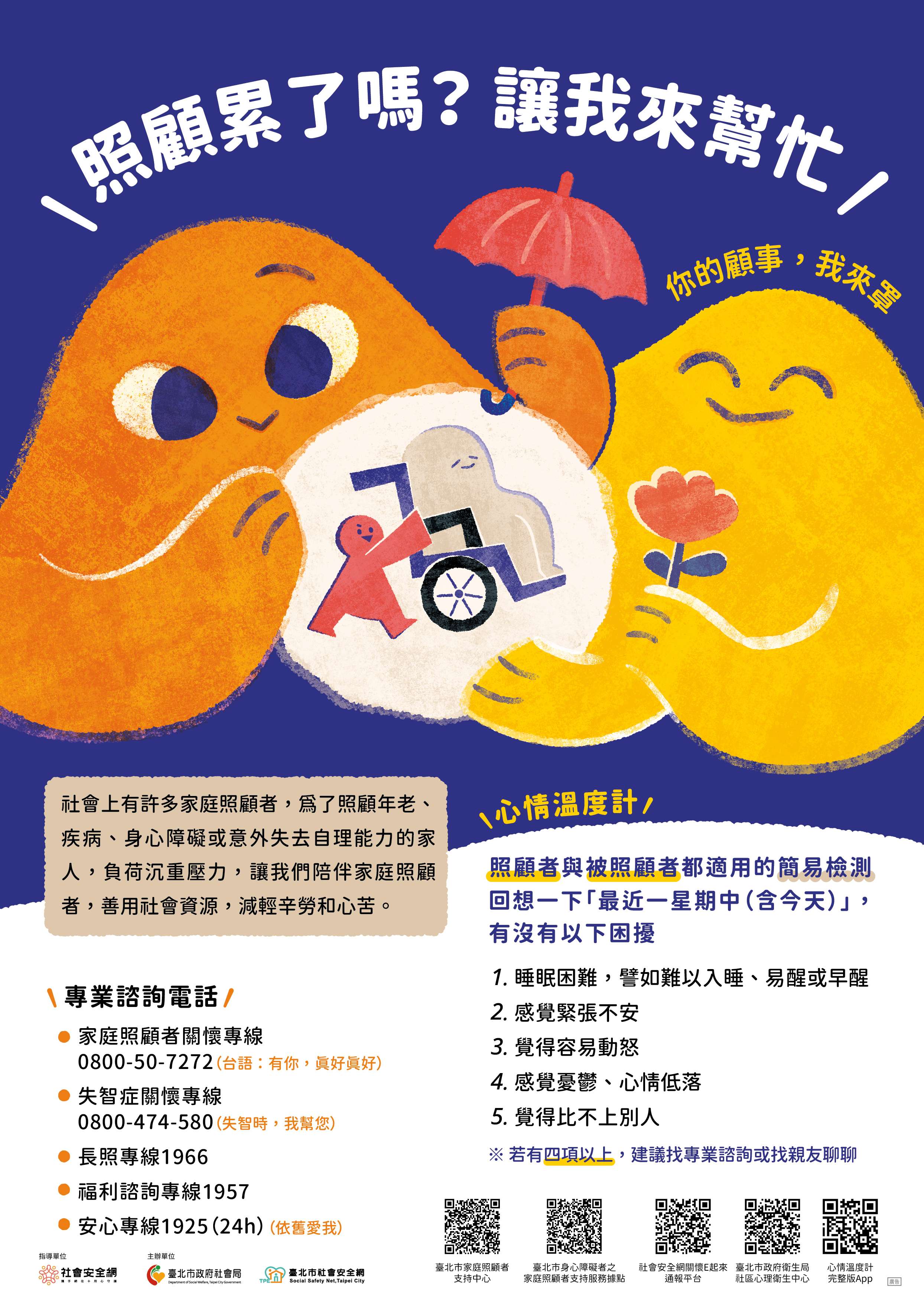 為關注「家庭照顧者」心理健康及需求,推廣社區友善互助及長期照顧資源,強化本市超高齡社會支持韌性,請參閱附件檔案相關訊息。