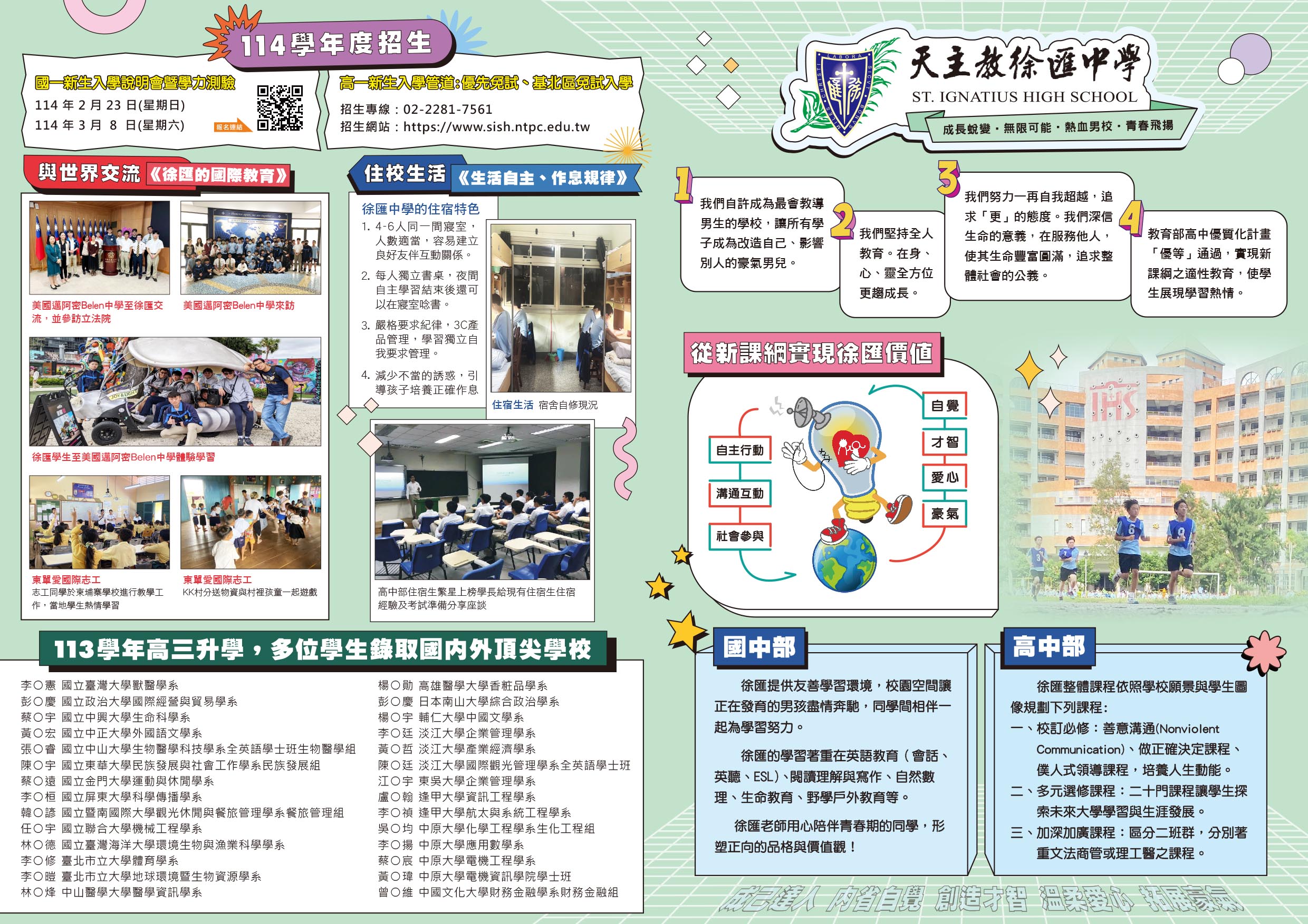 一、本校(新北市私立徐匯高級中學)著重培育學生具備自覺、才智、愛心、豪氣四大能力,歡迎六年級男生及家長參加本校辦理之新生說明會。