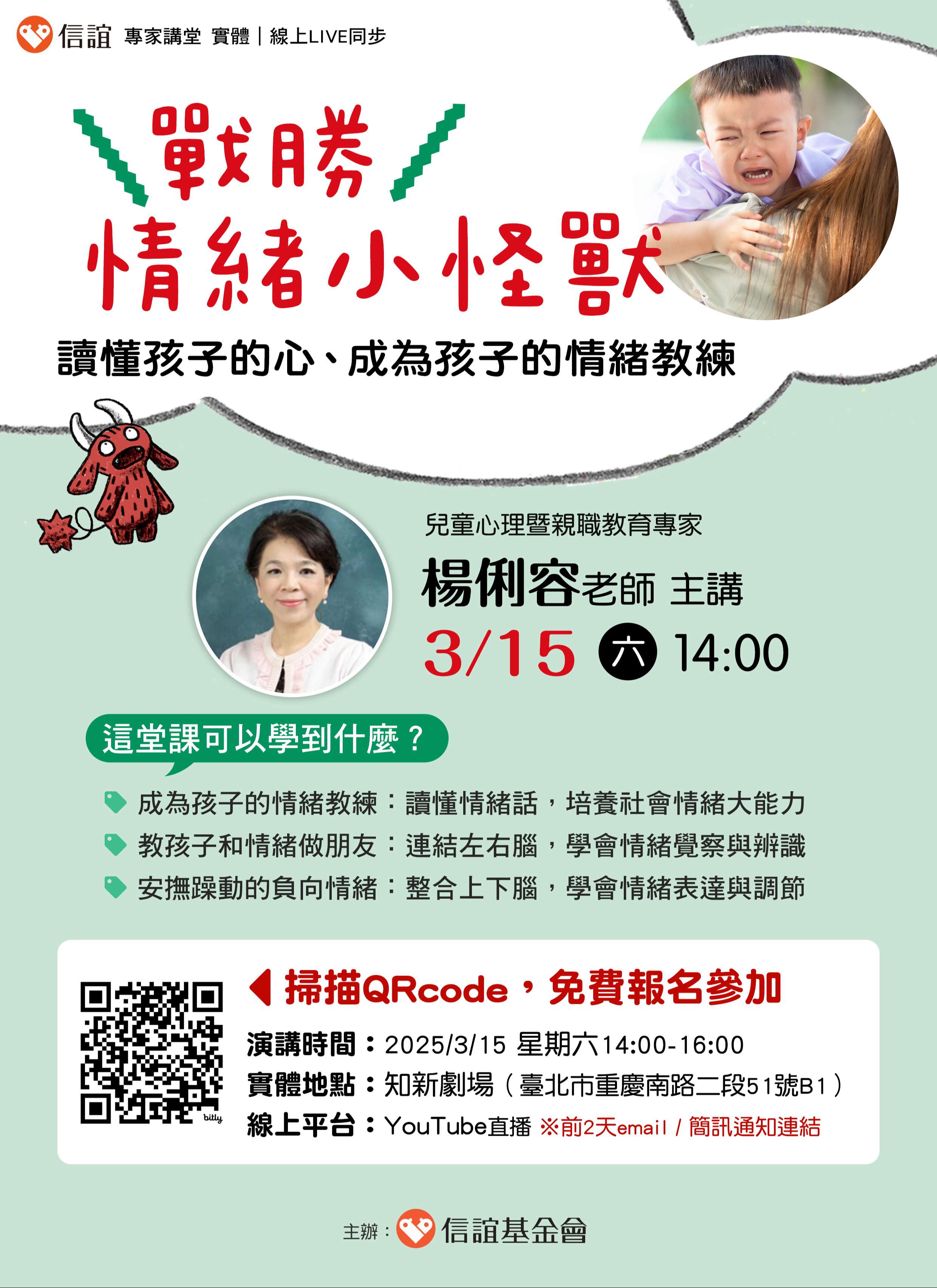 動不動就哭、說翻臉就翻臉、一言不合就打人…你以為的「壞脾氣」可能隱藏更多情緒?外在行為與反應是孩子表達感受最直接的方法,也是練習面對與應對情緒的絕佳機會。信誼專家講堂將於2025年3月15日(六)下午2:00-4:00舉辦【戰勝情緒小怪獸!讀懂孩子的心、成為孩子的情緒教練】實體/線上LIVE 講座,邀請爸媽免費報名參加。