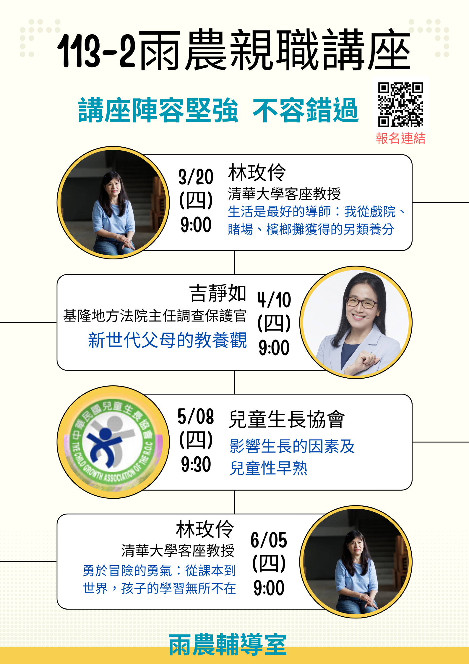 一、 雨農國小3至6月共計辦理四場親職講座課程,結合愛的存款簿學習集點活動給予時數,地點在雨農國小活動中心一樓視聽教室。講座課程內容如下: