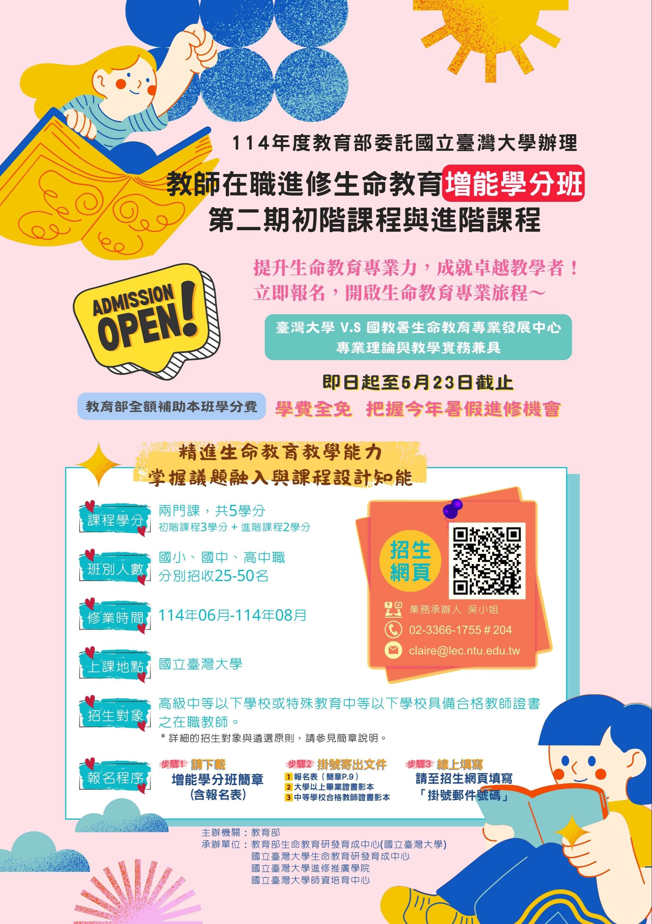 教育部委託國立臺灣大學辦理「114年度教師在職進修生命教育增能學分班」及「114年度高級中等學校綜合活動領域生命教育科教師在職進修第二專長學分班」招生簡章如下: