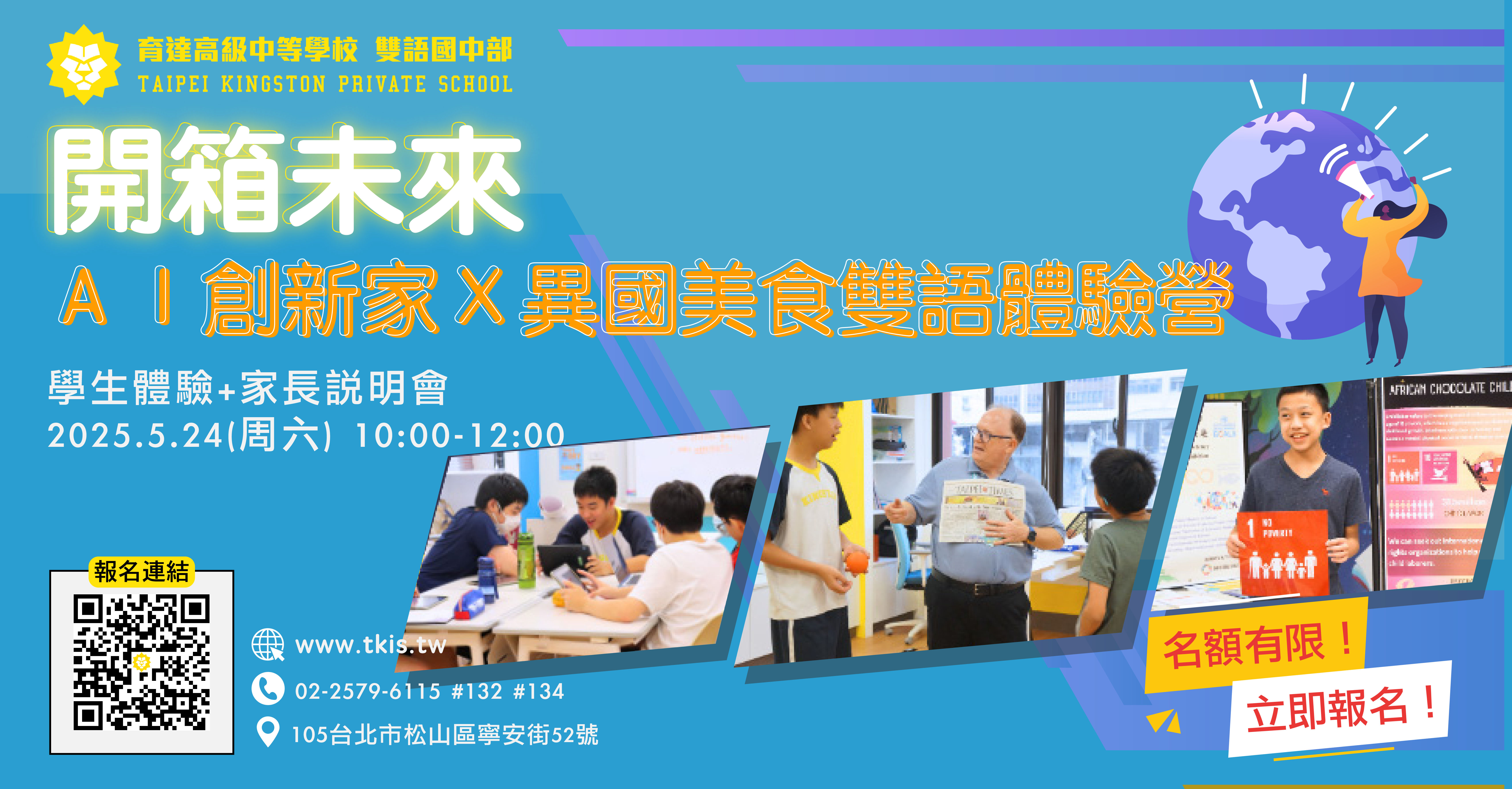 一、課程介紹:在全球化的時代,雙語能力是孩子未來發展的重要資產,本次Kingston雙語體驗營集結本校外師與中師,設計一系列豐富有趣的體驗課程,讓學生能在半日的課程中學習如何以地球永續的概念,結合AI科技趨勢,設計未來產品,外師分享異國美食文化,打開國際觀!我們也在同一時間安排入學說明會,深入介紹我們的課程規劃與環境導覽,歡迎爸爸媽媽帶著您的孩子一同報名參加!