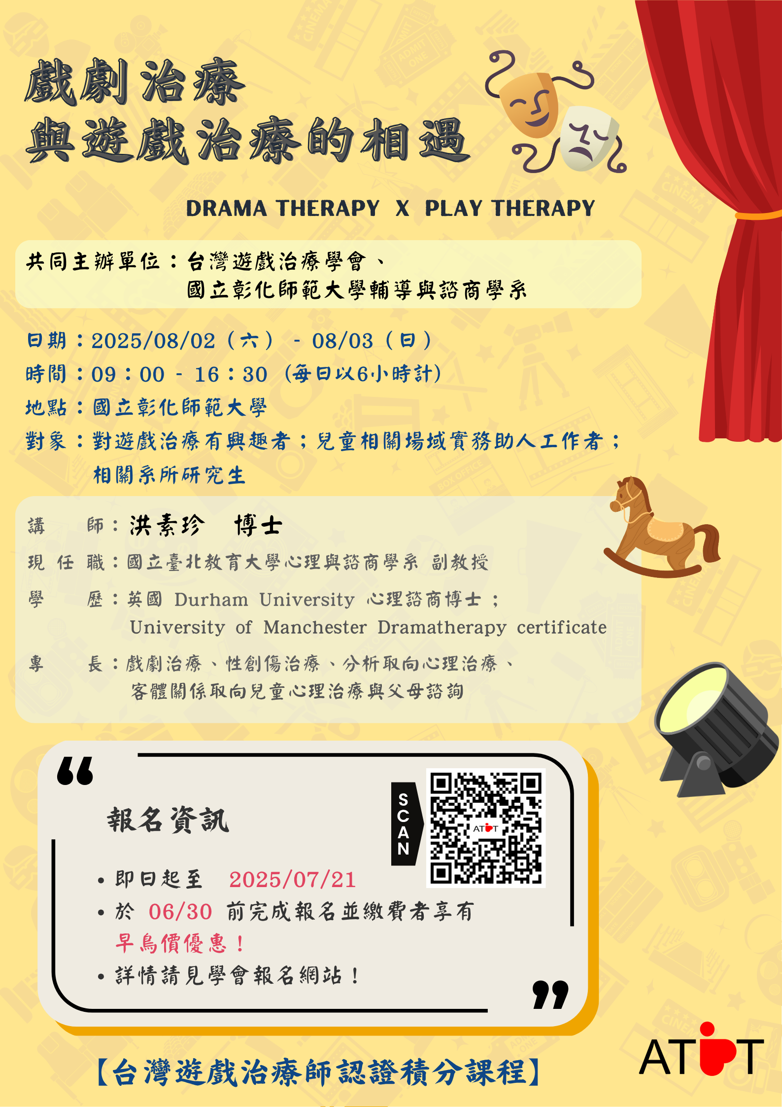 2、於06/30前完成報名並繳費者,享有早鳥優惠價!請參考學會報名網站(https://www.atpt.org.tw/courseid-205)。