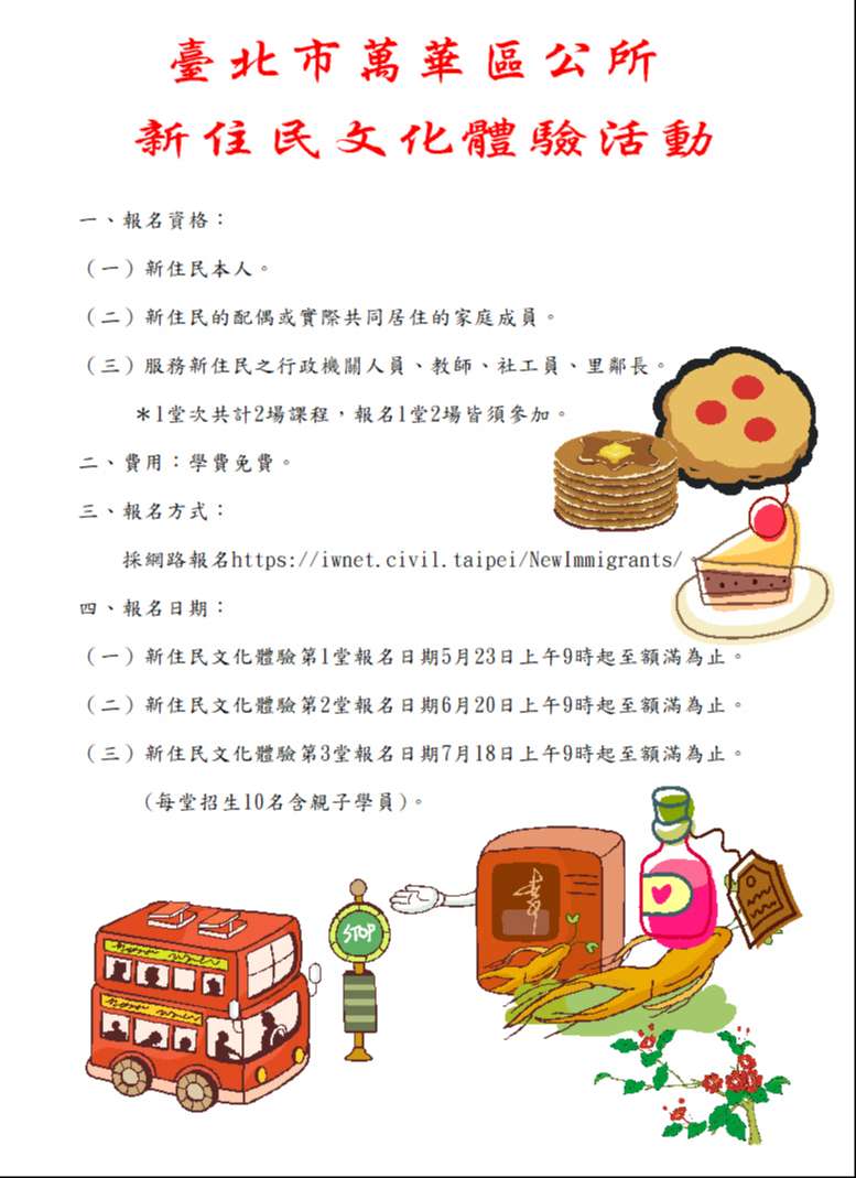 體驗活動歡迎報名參加,報名網址: https://iwnet.civil.taipei/NewImmigrants/。詳情請參閱萬華區公所網站或電洽(02)2306-4468轉204陸先生