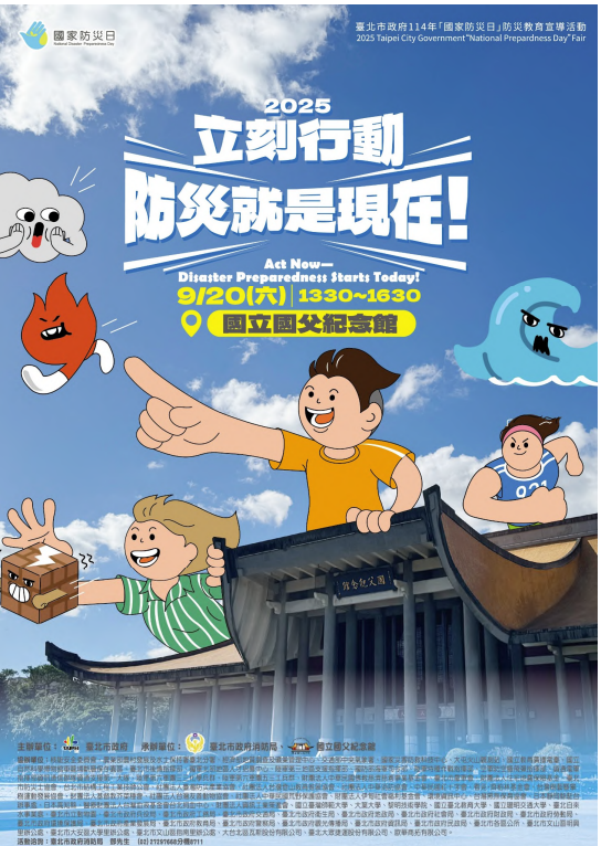 9月20日下午國父紀念館,國家防災日活動「立刻行動 防災 就是現在!」,互動闖關學防災,防災手作樂趣多,歡迎您 來挑戰成為防災達人!闖關集點就送精美禮品,全家大小一 起樂防災!