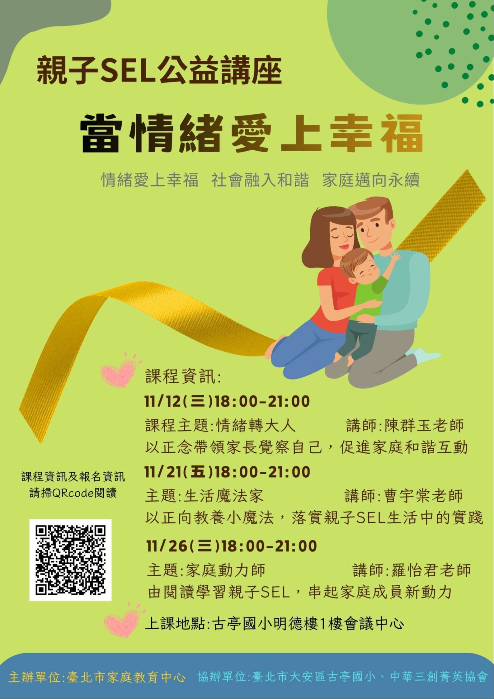 一、古亭國小與中華三創菁英協會辦理親子SEL公益講座三場,活動 內容以讓家長對SEL社會情緒學習有更多認識,進而融入家 庭親子互動,提升教養功能。