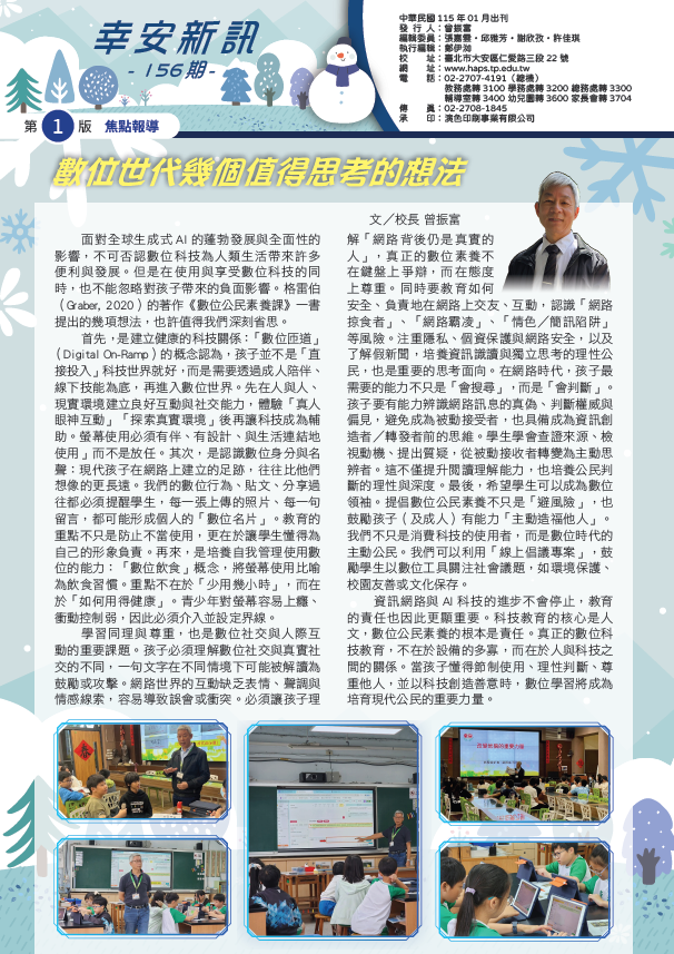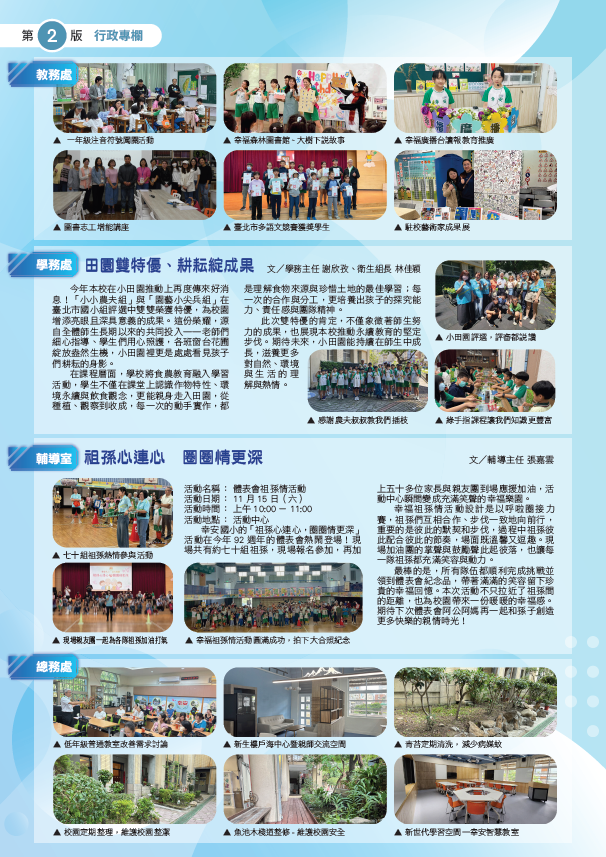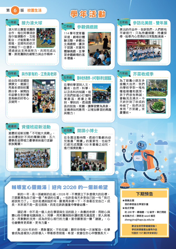 各學年活動花絮一次收錄,輔導室心靈雞湯與下期徵稿邀文,一起共創幸福校園紀錄!