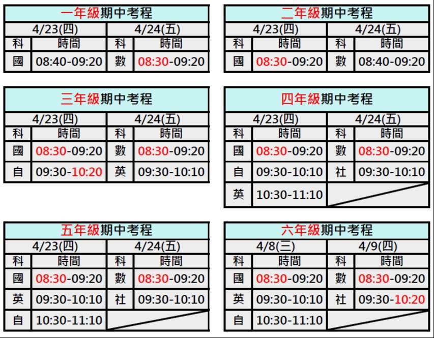 | 國 | 08:40-09:20 | 數 | 08:30-09:20 |