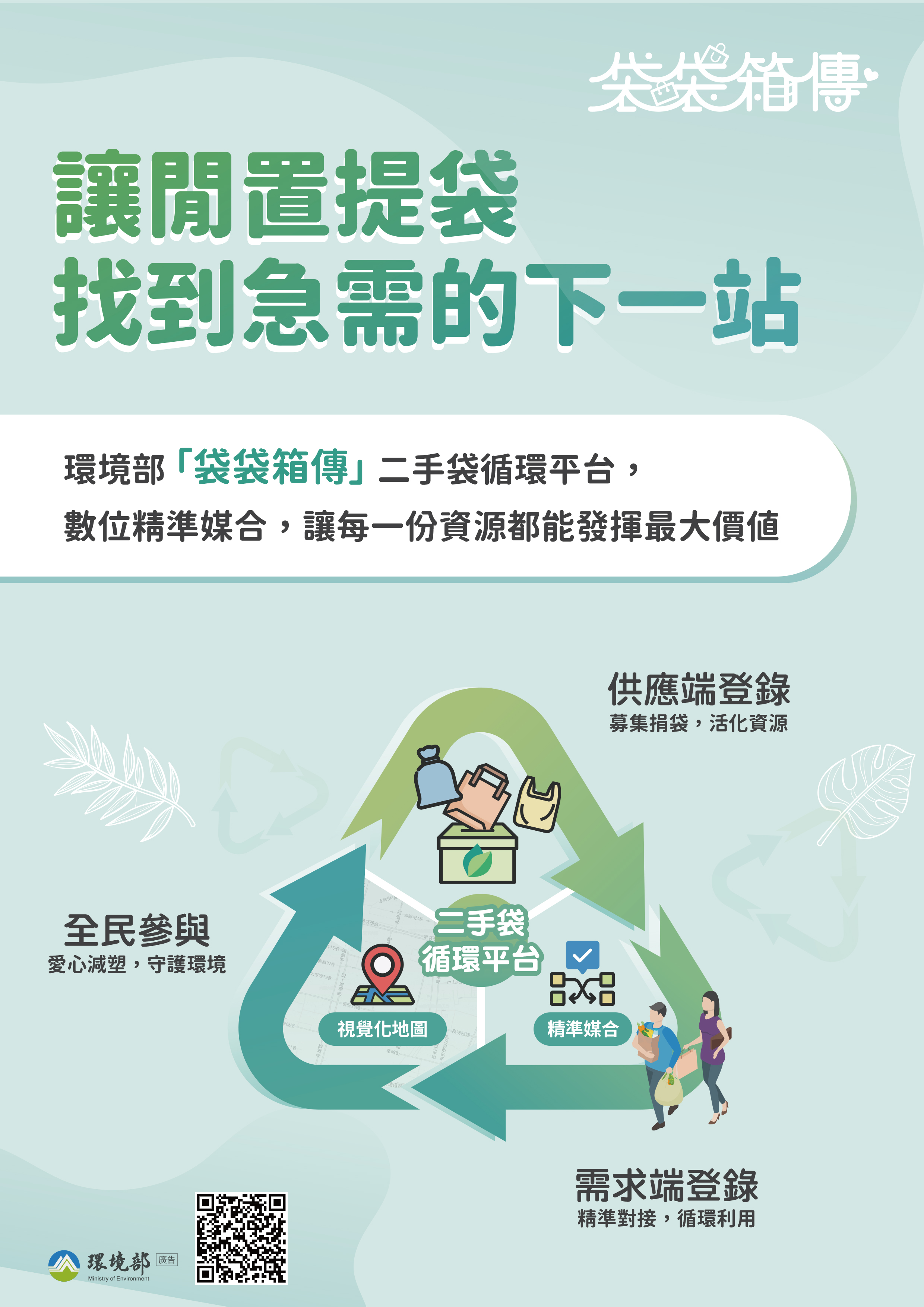 一、為因應全球原物料及環境的挑戰,環境部建置「袋袋箱 傳」二手袋循環平台(https://sup.moenv.gov.tw/Page /rebag),期公私協力透過該平台連結可提供二手袋的企業與需要二手袋的商家,讓二手紙袋及購物袋循環流動, 實現「減廢、省錢、護地球」的共贏生活圈。