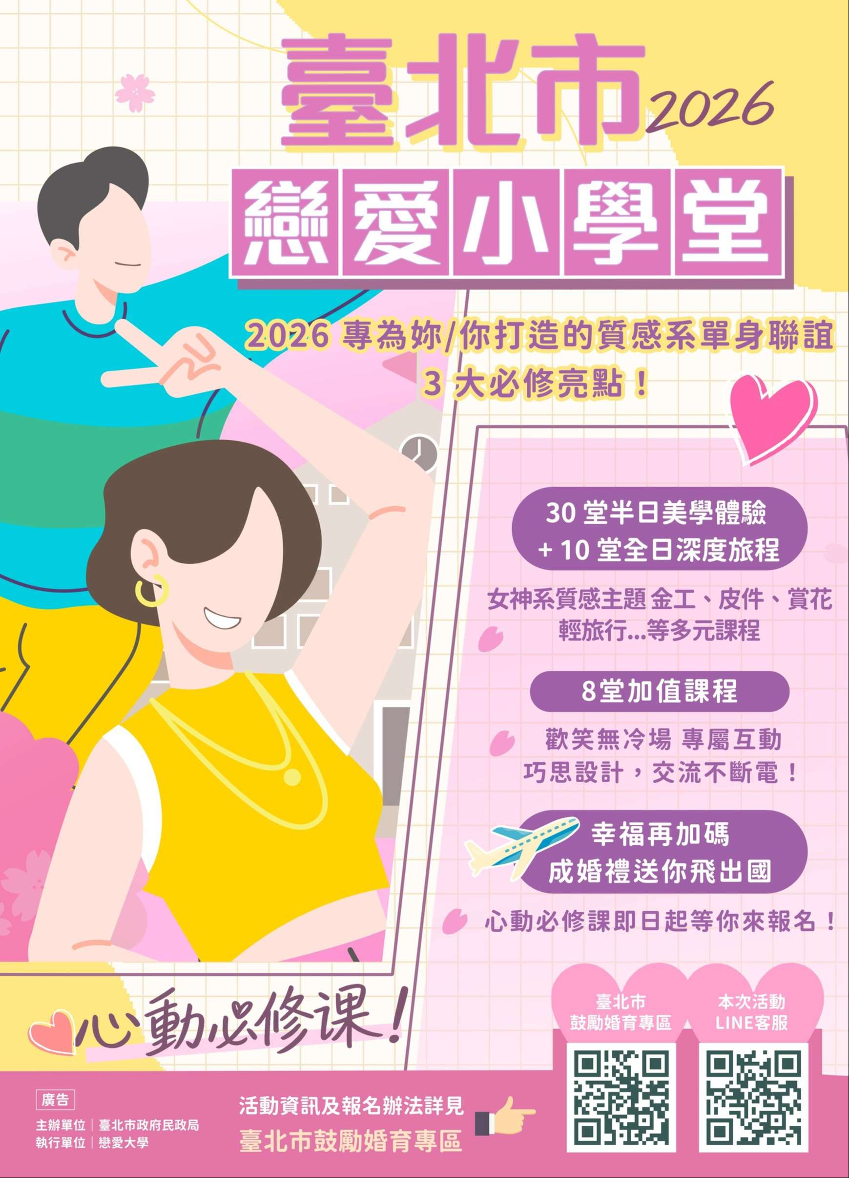 旨揭活動辦理期間為115年6月6日起至12月5日止,共計 40 場次;凡年滿 25 歲以上在臺設有戶籍之單身朋友即可報 名參加。活動採線上表單方式報名,第1梯次(第1至10 場)活動報名自115年5月8日上午10時起至5月17日17時 止,其他3梯次將陸續開放,活動詳情及報名連結可至臺北 市鼓勵婚育專區查詢(https://loveactually.gov. taipei /)。